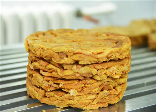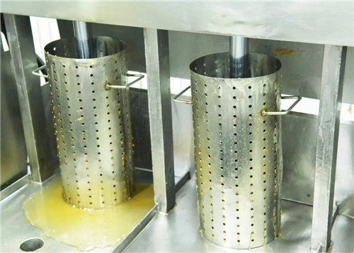 进入压榨环节以前采用传统的压榨模式,有时压力过大,产品像石头一样硬,有时太松不成形。后来研发设备,每份约1.5斤放入隔板板,一键操作:挤压去掉多余油脂,保证产品稳定。3-5分钟趁热装筒压榨,保持酥脆口感。6比1的超低产出比。