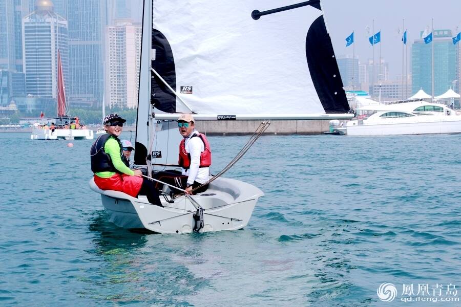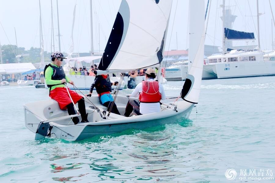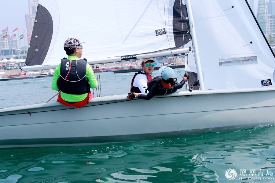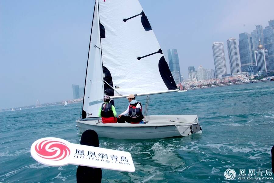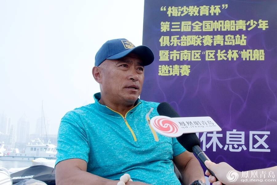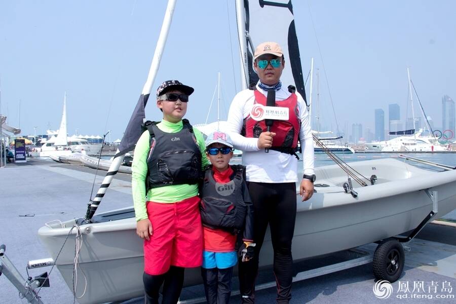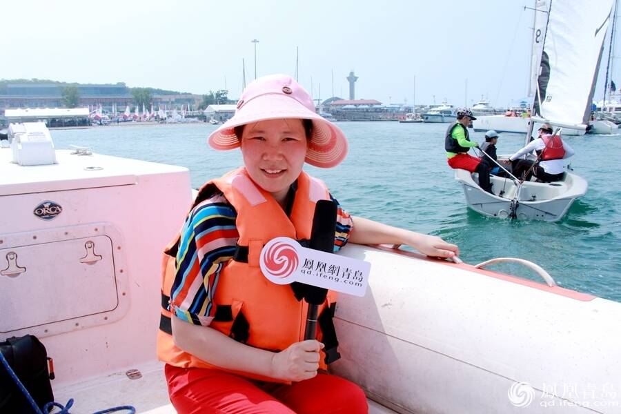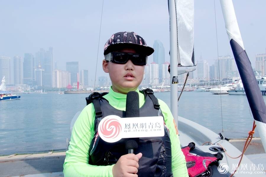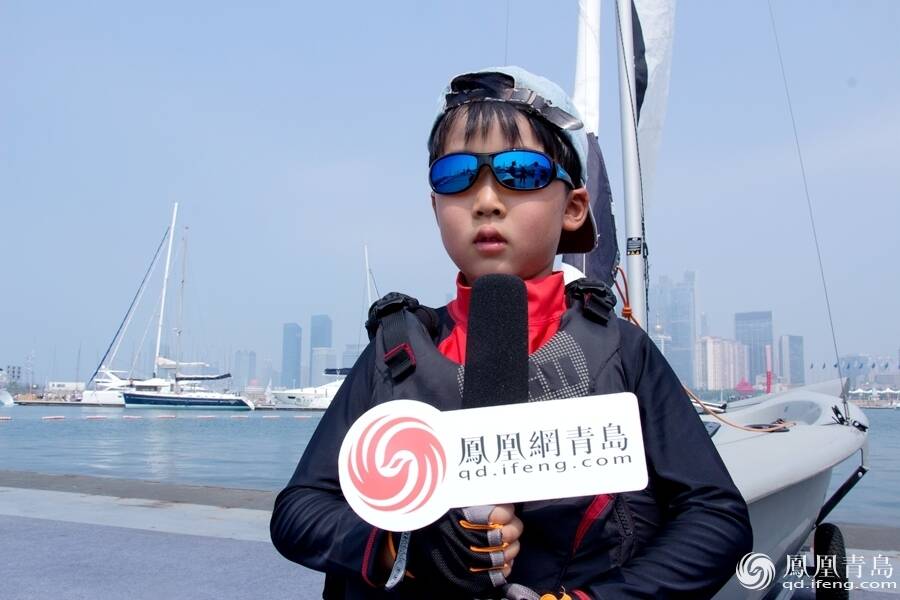 参赛的小队员接受凤凰网青岛的采访,虽然人小,但是跟着爸爸一起开着帆船一点都不感到害怕。