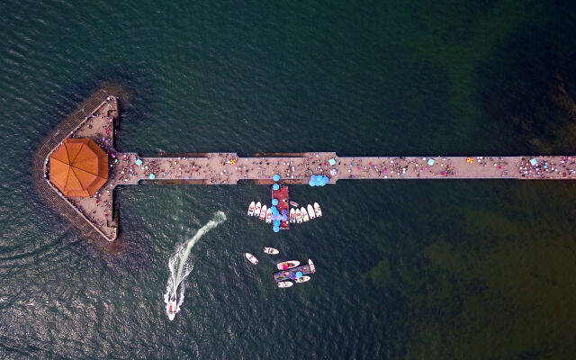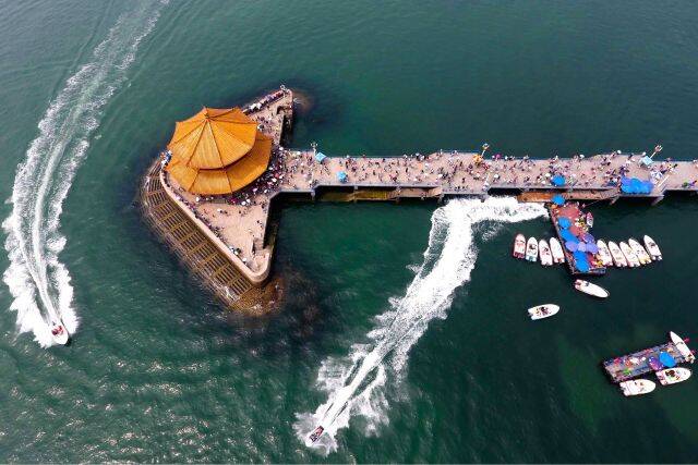 ↑俯瞰青岛栈桥(8月10日摄)。新华社记者 王建华 摄