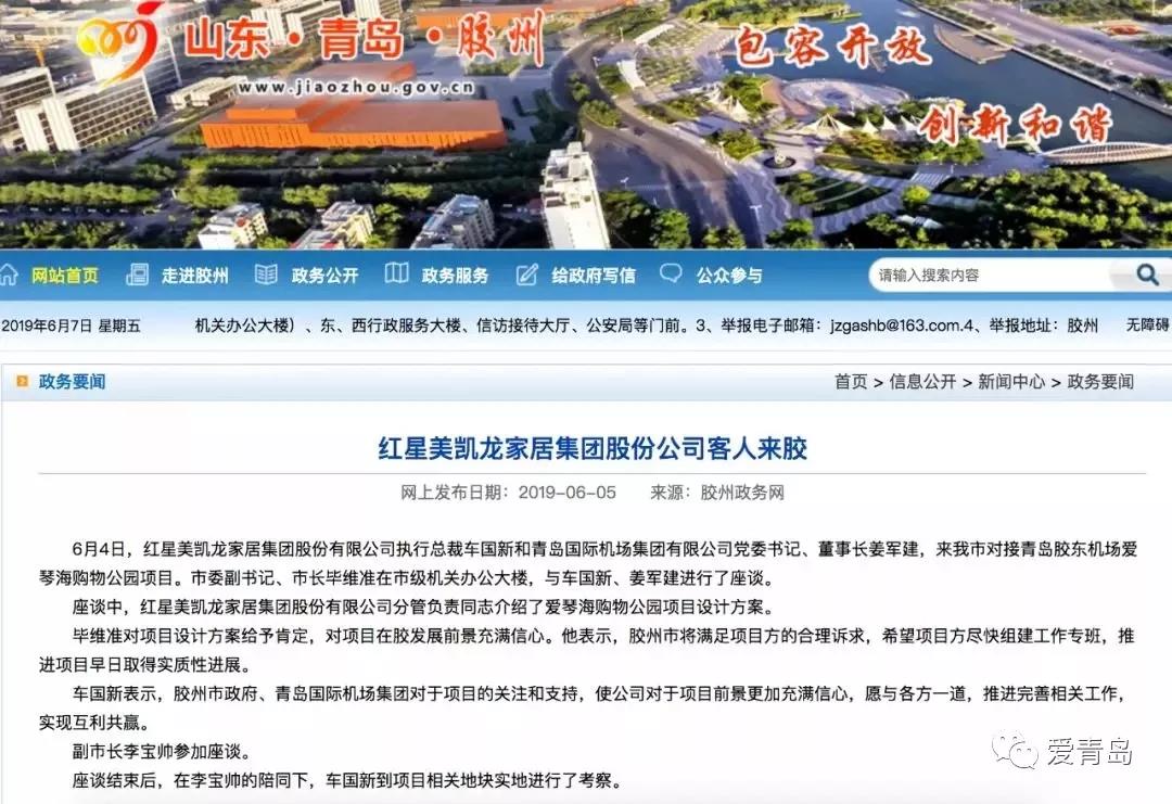 6月4日,红星美凯龙家居集团股份有限公司执行总裁车国新和青岛国际机场集团有限公司党委书记、董事长姜军建,来胶州市对接青岛胶东机场爱琴海购物公园项目。胶州市委副书记、市长毕维准在胶州市级机关办公大楼与车国新、姜军建进行了座谈。
