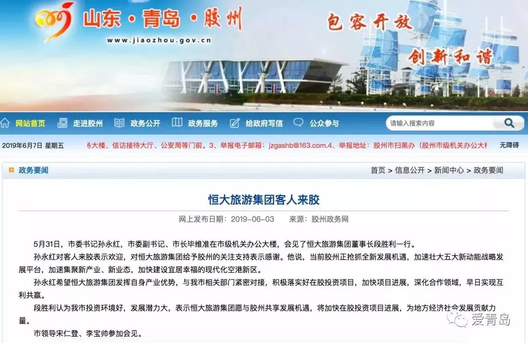 据胶州政务网消息,5月31日,恒大旅游集团董事长段胜利一行到访胶州,与胶州市委书记孙永红,市委副书记、市长毕维准举行会谈。